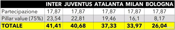 另外,随着欧战开打,欧足联的欧战奖金也分配了下来,分为基础奖金和市场份额奖金两部分,意甲五队的基础奖金都是1787万欧,而市场份额奖金主要是转播分成,这一部分国米作为意甲卫冕冠军和一档球队,可以拿到2354万欧,是各队最高的。另外,小组赛阶段还有每场比赛的奖金,赢球210万欧,平局就是70万欧,多赢多得!